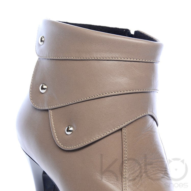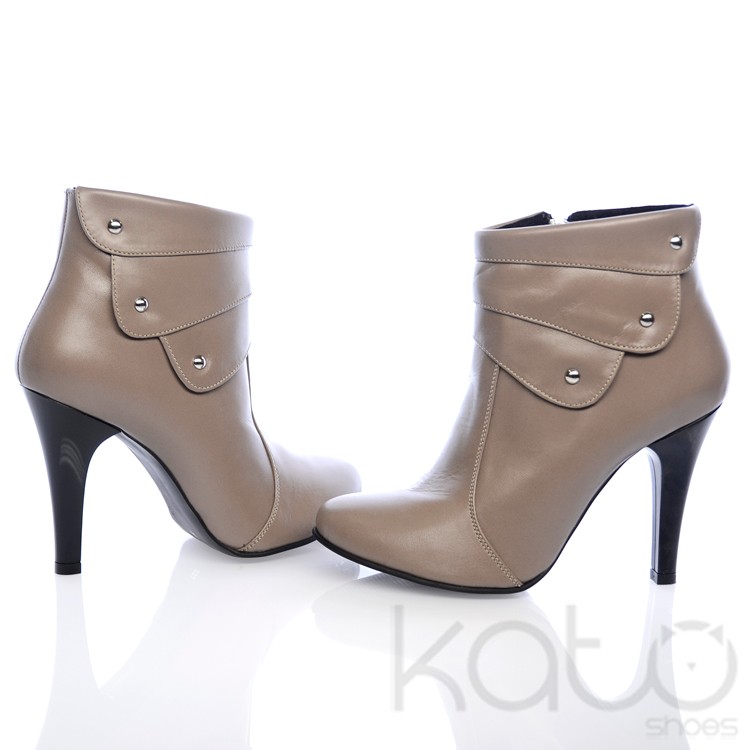 Botine dama Neno din piele cu fermoar. Culoare deosebita, un bej/cafea cu lapte, cu 3 petale din aceeasi piele fixate in 3 capse, ce le confera un plus de eleganta. Toc normal de 9 cm, de culoare neagra. Interior captusit cu material termo izolant.