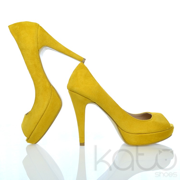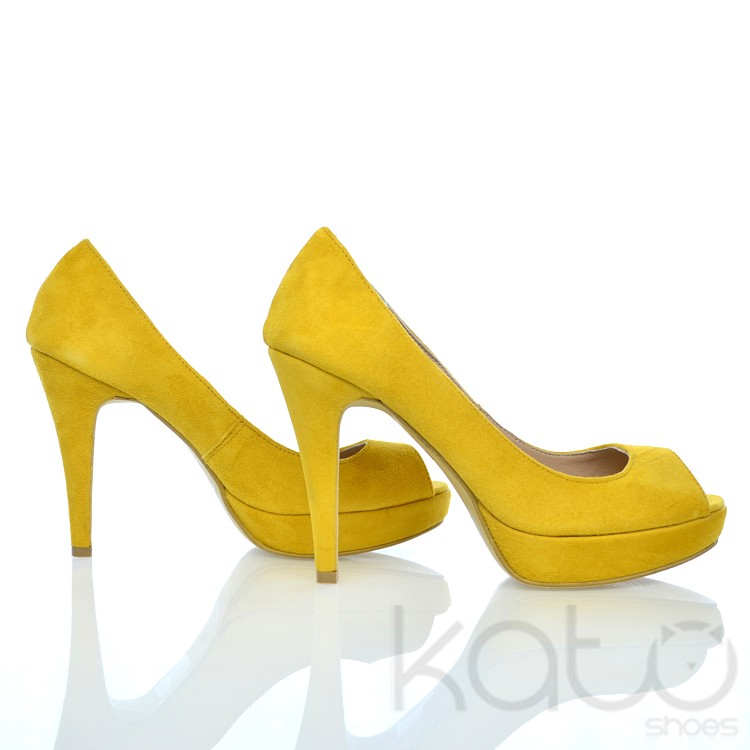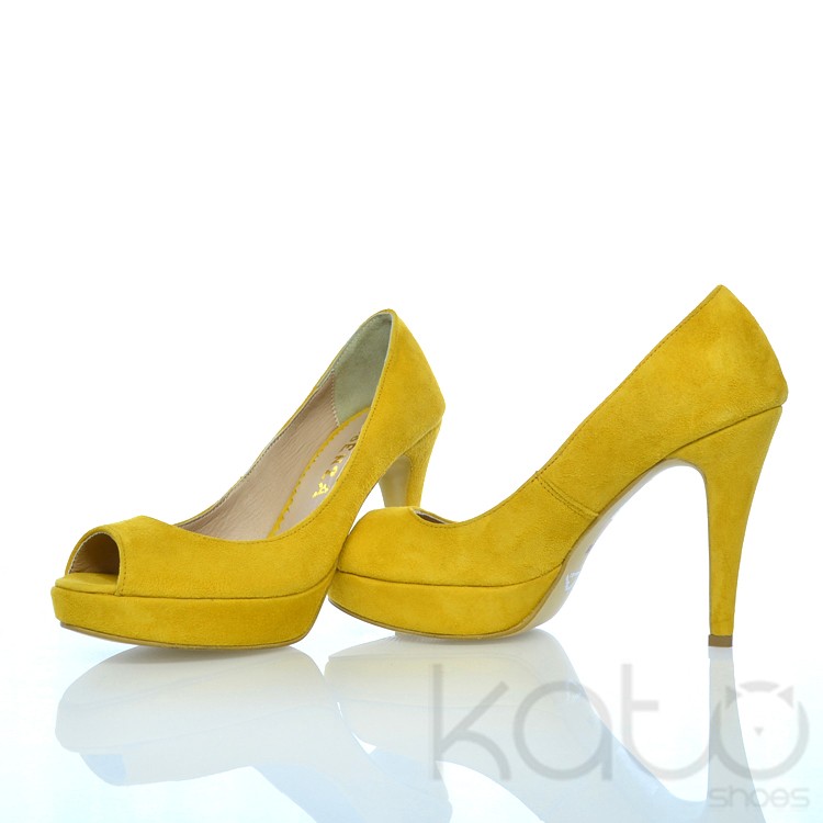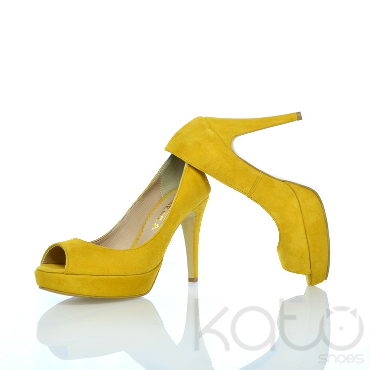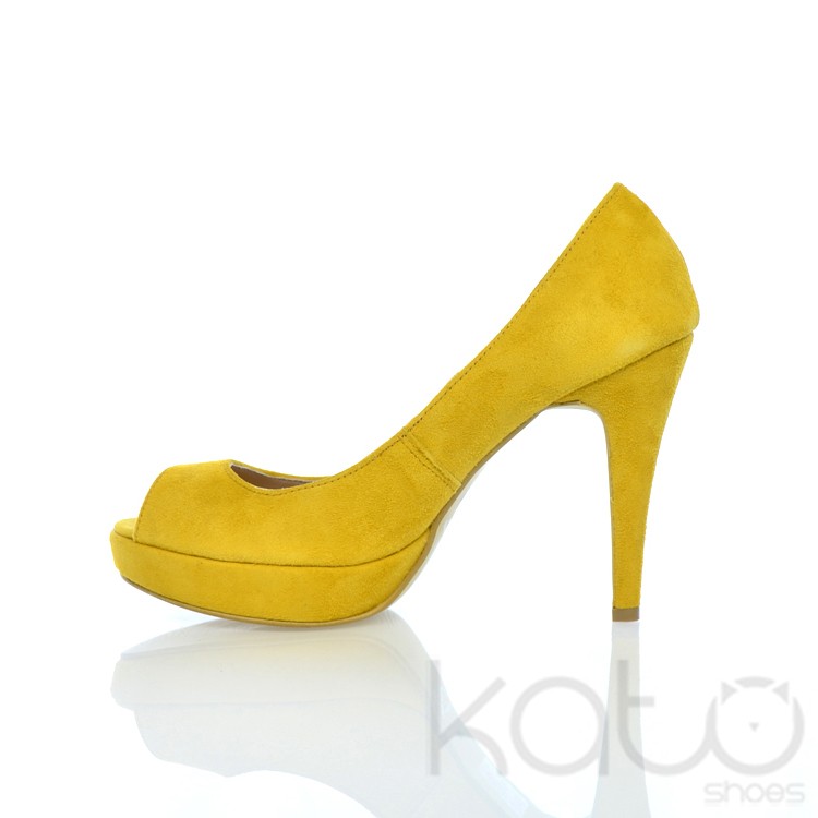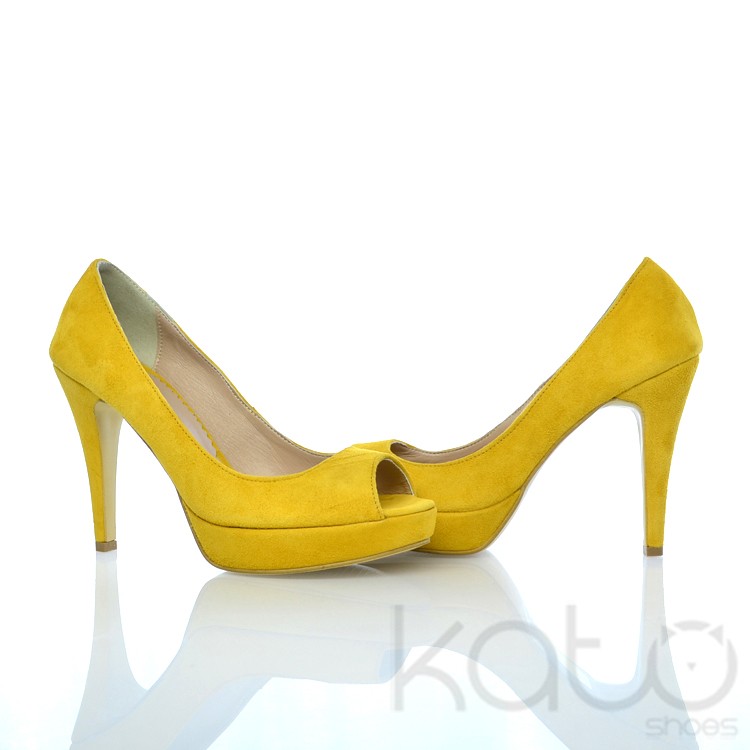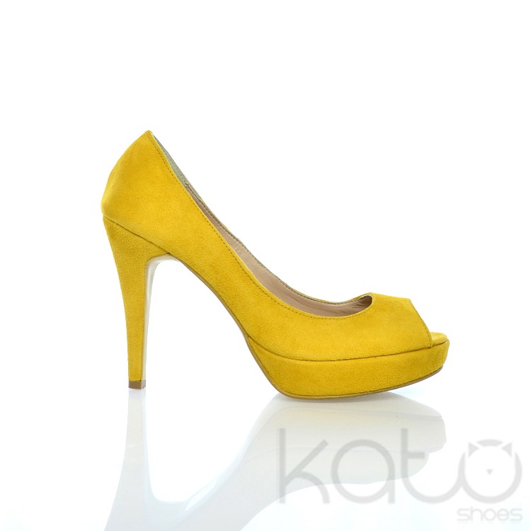 Pantof Essenza cu platforma si decupaj frontal, din piele velour galben, cu toc stilleto imbracat in aceeasi piele.