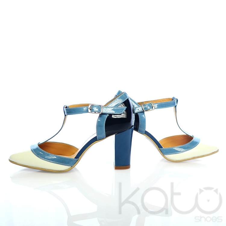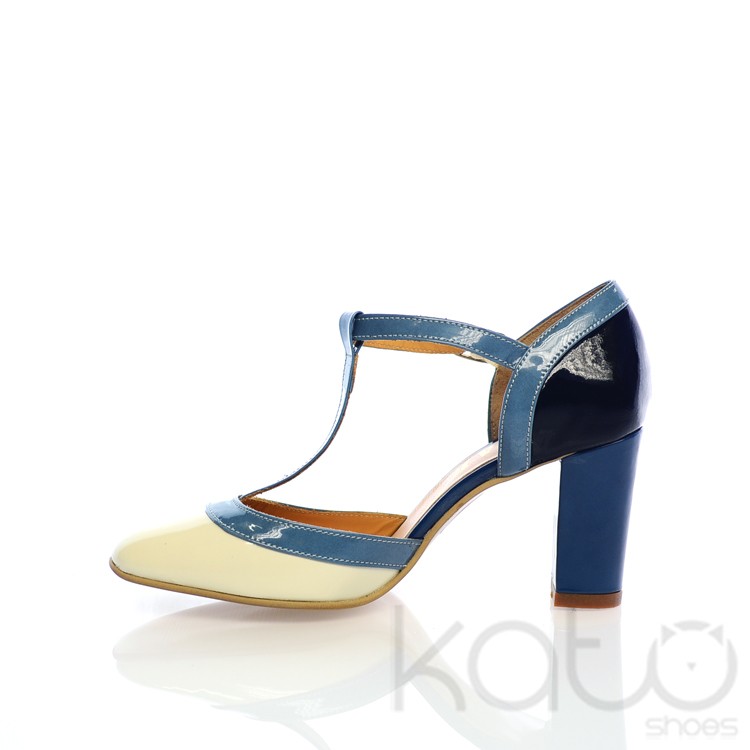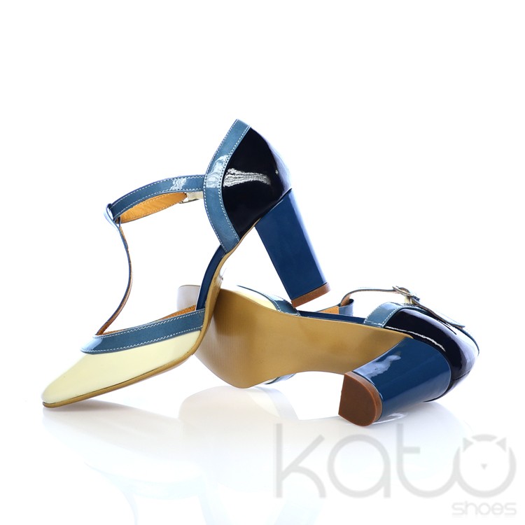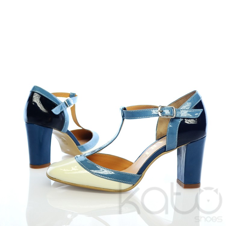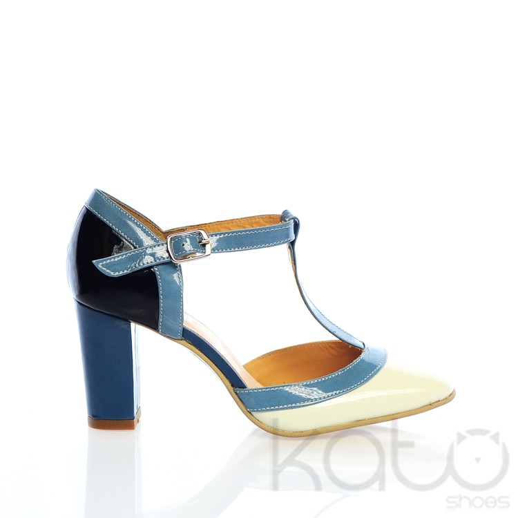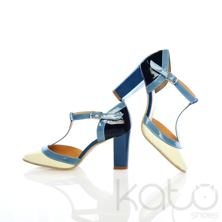 Pantof din piele lacuita, cu bareta reglabila pe glezna si tiv de culoare albastru deschis, toc gros de culoare albastru, calcai negru si varf alb. Culori in stil italian.