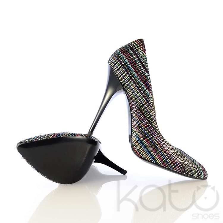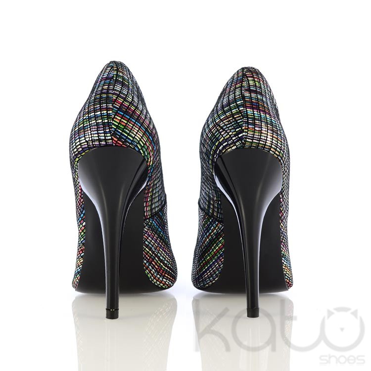 Pantofi Neno din piele velour cu imprimeu multicolor. Toc stiletto lucios negru de 9 cm. Varf semi-ascutit.