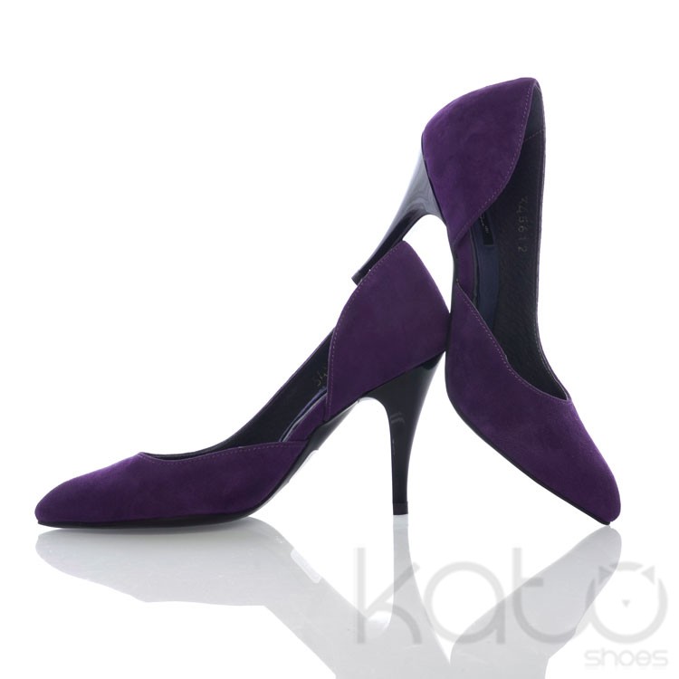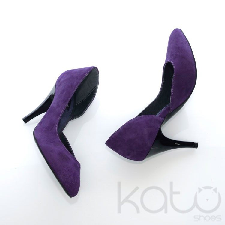 Pantofi decupati de la Neno din piele intoarsa de culoare Mov. Toc negru lucios de 9 cm. Varf semiascutit.