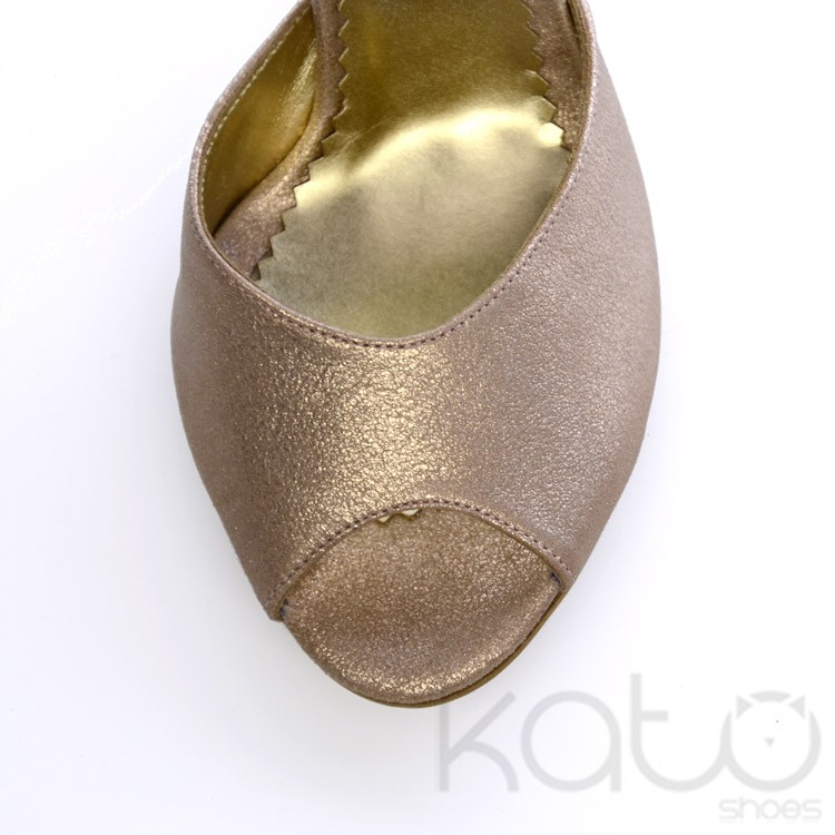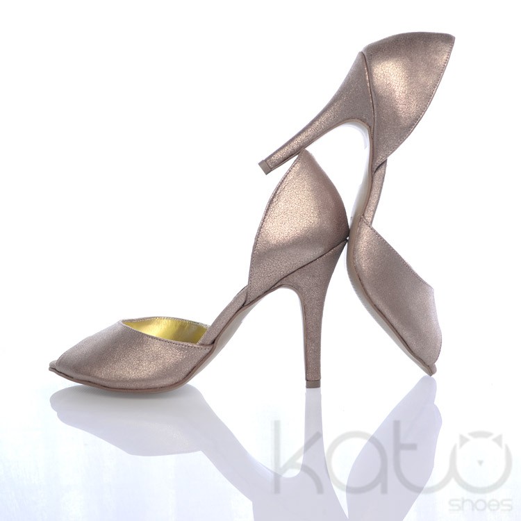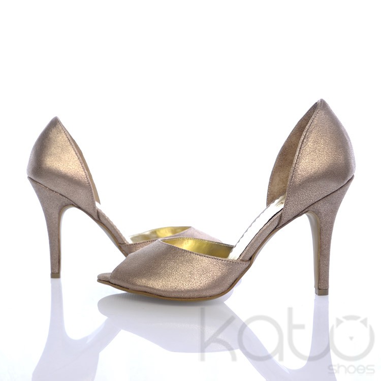 Sandale Essenza cu bareta lata peste degete, cu staif, din piele de culoare Bronz-Auriu, si toc stiletto din acelasi material.