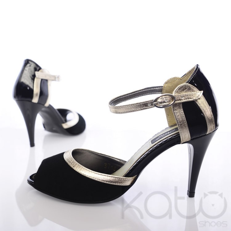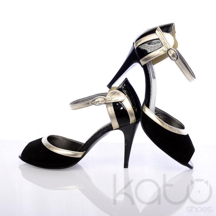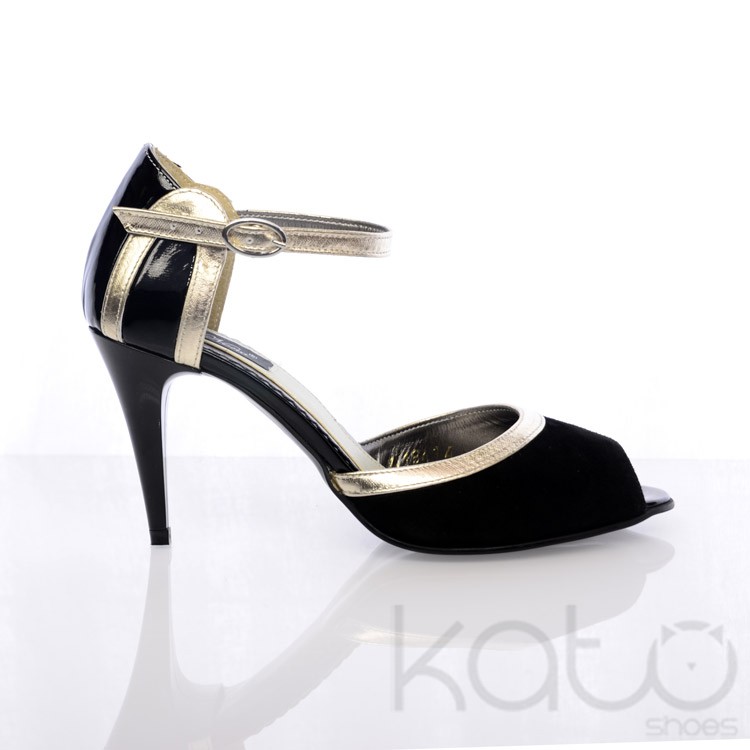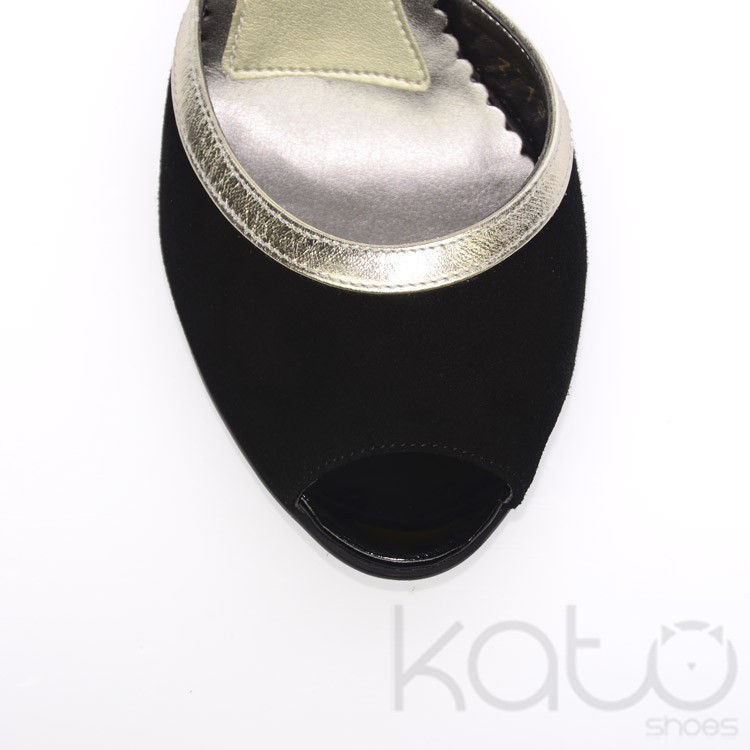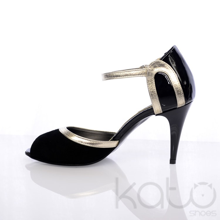 Sandale elegante Neno, dintr-o combinatie reusita de piele lacuita neagra, piele box aurie si piele velourata neagra(camoscio, un velour extrem de fin).