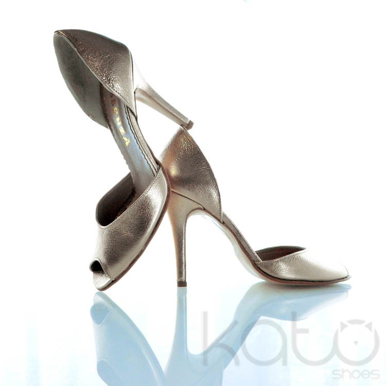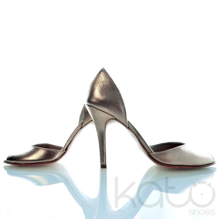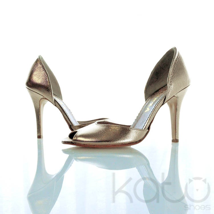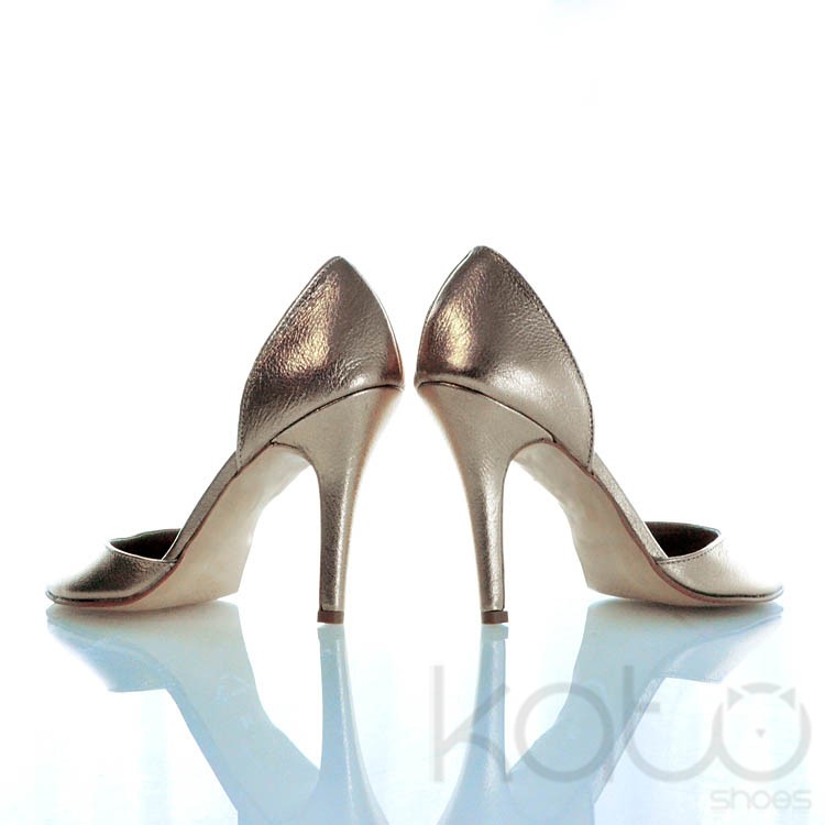 Sandale Essenza cu bareta lata peste degete, fara staif, din piele de culoare Aurie, si toc stiletto din acelasi material.