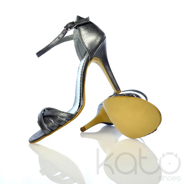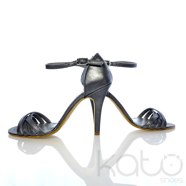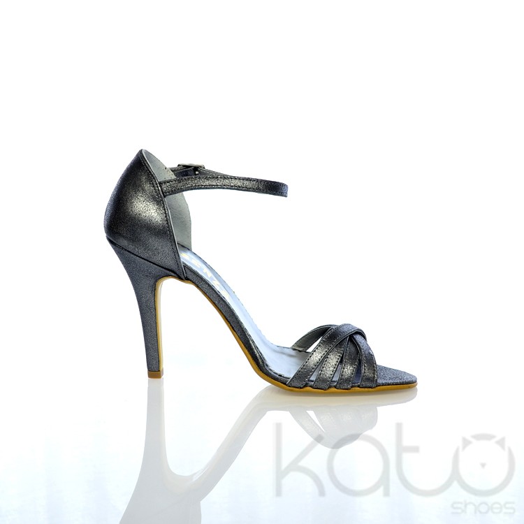 Sandale Essenza cu barete inguste peste degete si staif din piele gri sidefata metalizat cu toc stiletto.